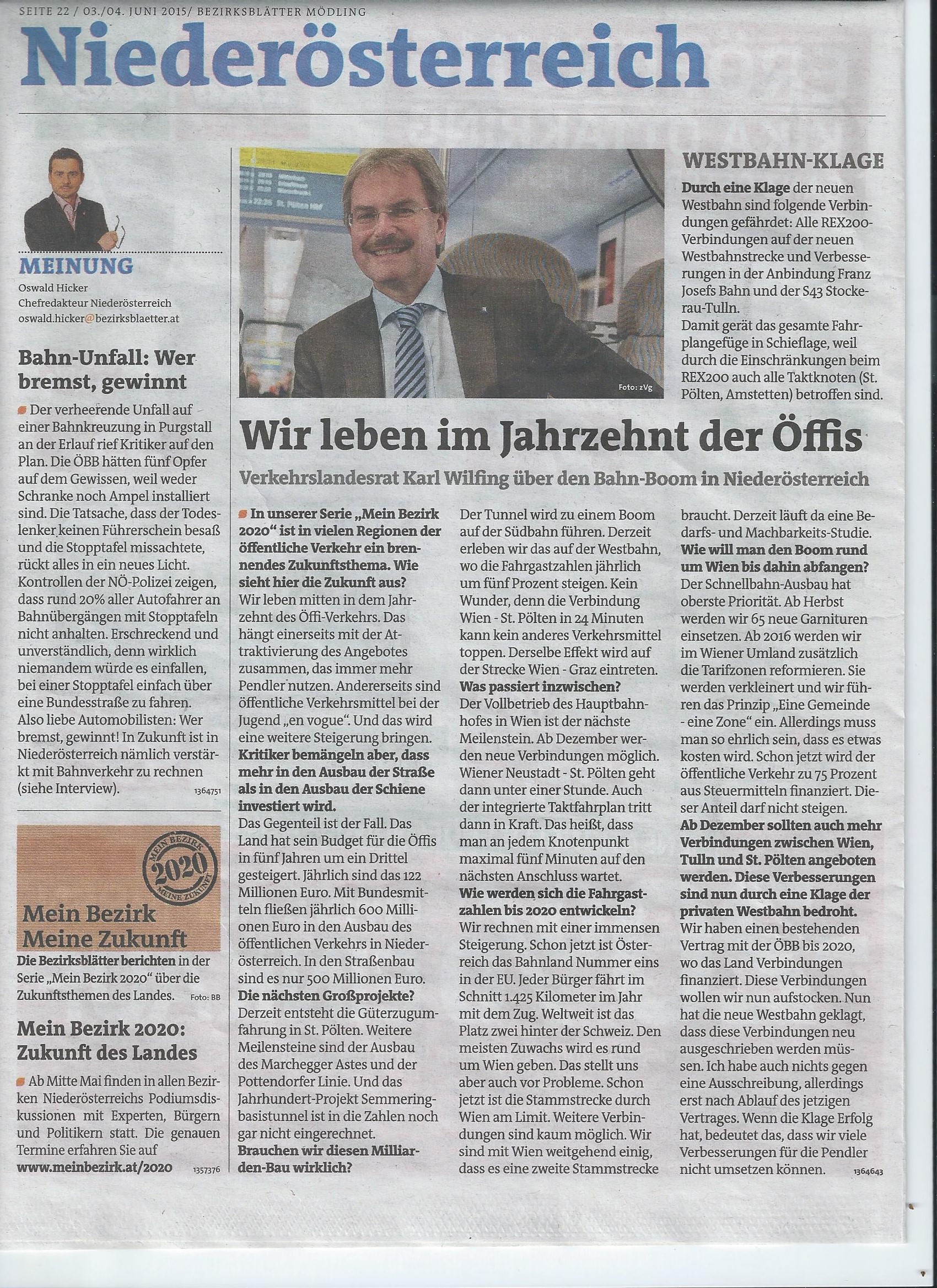 In einem Artikel der Bezirksblätter erklärt Wilfing uns, dass das Land NÖ in den Ausbau der Schiene jährlich mehr (600 Mio) investiert, als in den Ausbau der Straße (500 Mio). 535_Bezirksblätter_Wilfing-1.jpg(1378)Buchhalter sollte er nicht werden, der Herr Landesrat. Denn bei den Öffis zählt er die Ausgaben von Bund und Land zusammen, beim Straßenverkehr beschränkt er sich auf die Ausgaben des Landes.