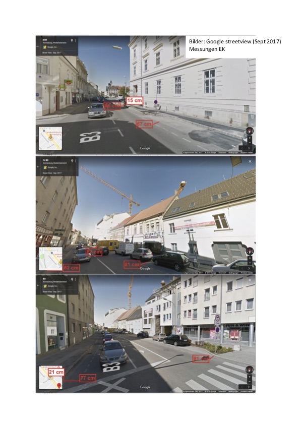 Der "markierte Fahrbahnrand" auf der B3 innerhalb des Rings "animiert" RadfahrerInnen, ihn zu benutzen - auch wenn er eigentlich zu schmal ist, um die Sicherheit zu erhöhen. Insbesondere im Bereich der Parkplätze ist hier das Risiko, durch Dooring ("Köpfler" über eine Autotür) groß.Ein aktuelles Urteil des Wiener VWG attestiert, dass man hier in einem Abstand von etwa einem Meter zu den geparkten KFZ fahren muss, um eine körperliche Selbstgefährdung auszuschließen. Der Streifen neben der Fahrbahn ist zwischen Ring und Hauptplatz an keiner Stelle 1 m breit! 623_Wrstr_HP_Ring.jpg(1285)